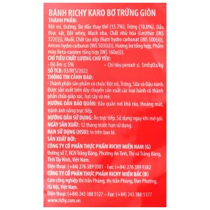 Bánh quy trứng xốp, giòn tan trong miệng khi ăn, hấp dẫn vô cùng. Bánh bơ trứng Richy Karo gói 270g hương vị béo ngậy của bơ, sữa và vị ngọt dịu của mạch nha, gồm nhiều gói nhỏ tiện lợi, bánh quy Richy dễ dàng mang theo túi để thưởng thức và chia sẻ với bạn bè.