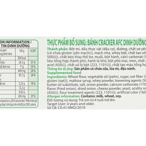 Bánh quy AFC có bổ sung khoai tây, cung cấp năng lượng, protein, chất xơ, đặc biệt là vitamin D và canxi giúp xương chắc khỏe và đồng thời tăng cường hệ tiêu hóa. Bánh cracker vị rau AFC Dinh Dưỡng hộp 172g thích hợp làm món bánh quy ăn nhẹ bổ dưỡng cho những người bận rộn.