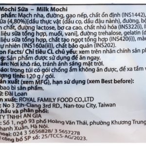 Bánh mochi nhân sữa Royal Family gói 120g là sản phẩm bánh ngọt với nhân vị sữa mềm béo và nhuyễn mịn thơm ngon. Bánh tươi Royal Family là thương hiệu bánh Đài Loan được yêu thích với nhiều loại bánh hấp dẫn.