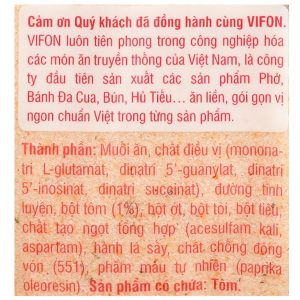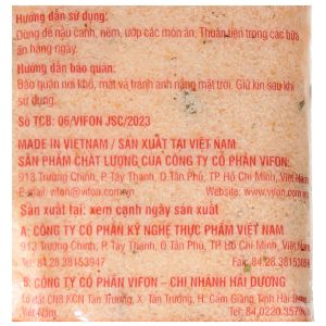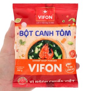 Bột canh tôm Vifon gói 200g với hương vị tôm đậm đà cùng các loại gia vị tự nhiên giúp cho món ăn thêm đậm vị, hấp dẫn. Bột canh Vifon là nhãn hiệu bột canh được xuất khẩu trên 100 quốc gia, đảm bảo an toàn vệ sinh thực phẩm.