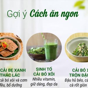 Cải bó xôi được sử dụng để chế biến thành nước ép hoặc kết hợp với các nguyên liệu khác để làm ra món sinh tố, giúp giảm cân và hỗ trợ tiêu hóa. Ngoài ra, cải bó xôi cũng được chế biến thành những món ăn ngon cho gia đình khi kết hợp với thịt heo, nấm, hải sản các loại,…
