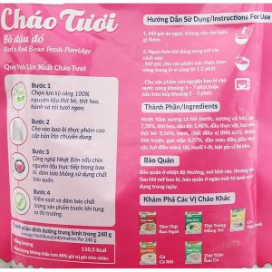 Cháo ăn liền tiện lợi từ thương hiệu cháo SG Food. Cháo tươi bò đậu đỏ SG Food gói 240g được làm từ các nguyên liệu tự nhiên, an toàn cho sức khỏe, hương vị cháo là sự kết hợp hài hòa của thịt bò và đậu đỏ bổ dưỡng, thơm ngon cùng mùi hương hấp dẫn mà lại cực nhanh và đơn giản
