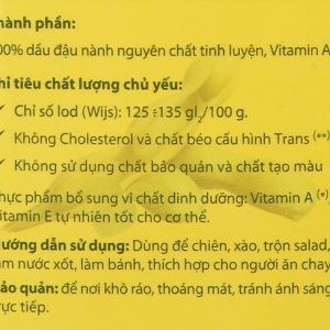 Được làm từ 100% dầu đậu nành nguyên chất tinh luyện, vitamin A. Sản phẩm giàu 3, 6, 9 sẽ giúp làm giảm nguy cơ tăng Cholesterol trong máu, tăng cường hệ thống miễn dịch, cho bạn nguồn dinh dưỡng tuyệt vời và một trái tim khoẻ mạnh.