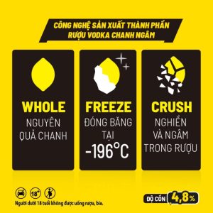 Đồ uống có cồn -196 Vodka Soda vị chanh lon 320ml là đồ uống có cồn với công thức pha chế kết hợp soda, Vodka cùng các nguyên liệu khác. Công nghệ đóng băng trái cây tại -196 °C, sau đó nghiền thành nguyên liệu của rượu Vodka chanh ngâm để giữ lại hương vị đậm đà của trái cây hoàn toàn tự nhiên.