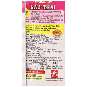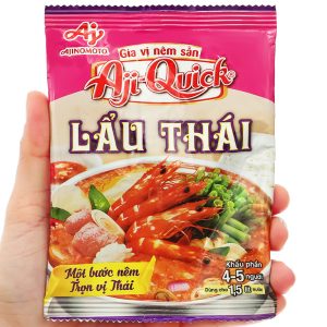 Là loại gia vị nêm sẵn hiện đang được rất nhiều người ưa chuộng của thương hiệu gia vị nêm sẵn Aji-Quick. Gia vị nêm sẵn nấu lẩu Thái Aji-Quick gói 50g là sự kết hợp hài hòa của tất cả các loại gia vị cần thiết, cho món lẩu thái chua cay đậm vị như ở nhà hàng ngay tại nhà.
