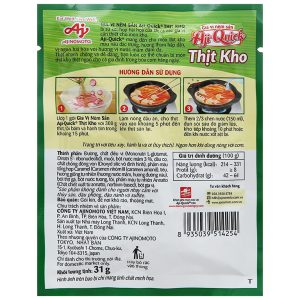 Là loại gia vị nêm sẵn kho thịt đến từ thương hiệu gia vị nêm sẵn Aji-Quick. Gia vị nêm sẵn thịt kho Aji-Quick gói 31g mang đến món thịt kho thơm ngon, đậm đà hương vị nguyên bản một cách nhanh chóng, giúp các bà nội trợ tiết kiệm thời gian chế biến mà vẫn đảm bảo dinh dưỡng.