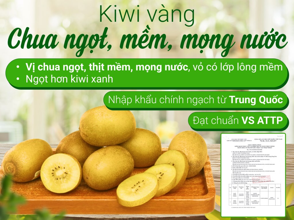 - Quả kiwi với lớp lông xù xì và có màu nâu xám. Kiwi vàng có thịt quả màu vàng nhạt đẹp mắt, với nhiều hạt đen tạo thành một vòng tròn xung quanh trục dọc của quả và vị chua ngọt mát rất đặc trưng.