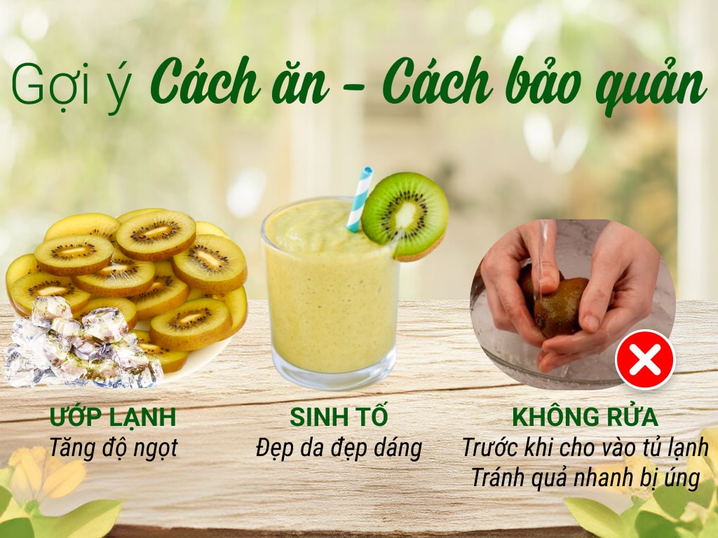 Kiwi nên để trong tủ lạnh với nhiệt độ từ 0 – 4 độ C để kiwi được tươi lâu và giữ được lượng Vitamin có lợi cho sức khỏe. Nên ăn kiwi khi vừa mới chín tới, và thời gian tối đa có thể để thêm từ khi kiwi chín là 5 ngày.