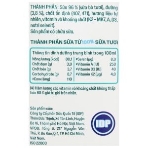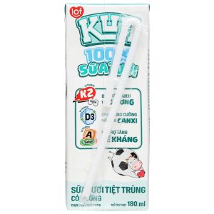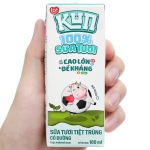 Lốc 4 hộp sữa tươi tiệt trùng có đường lof Kun 100% Sữa tươi 180ml giúp bé cao lớn hơn và tăng cường sức đề kháng nhờ có chứa Vitamin K2, D3, A và các khoáng chất như Canxi, Selen,… Sữa tươi Kun sử dụng 100% sữa tươi, không chứa chất bảo quản, màu và chất tạo ngọt tổng hợp.