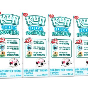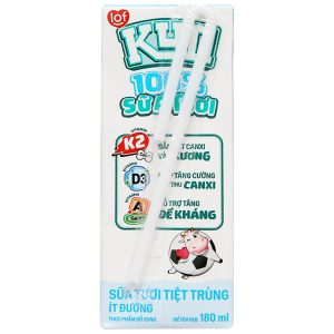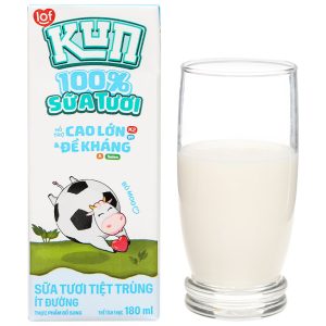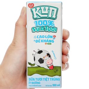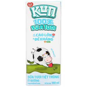 Lốc 4 hộp sữa tươi tiệt trùng ít đường Lof Kun 100% Sữa tươi 180ml hỗ trợ bé yêu phát triển cao lớn hơn và tăng cường sức đề kháng. Sữa tươi Kun làm hoàn toàn từ 100% sữa tươi, không chứa chất bảo quản, màu và chất tạo ngọt tổng hợp.