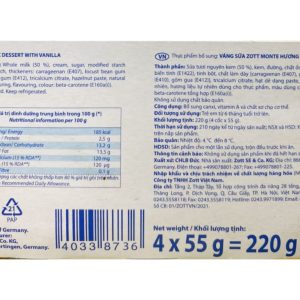 Váng sữa Monte là thương hiệu váng sữa có nguồn gốc từ Đức, bổ sung năng lượng và các chất dinh dưỡng cho các bé và cả người lớn. Lốc 4 hộp váng sữa vani Monte 55g làm từ 100% sữa tươi, có bổ sung thêm vitamin A và canxi, phù hợp cho bé từ 6 tháng tuổi.