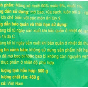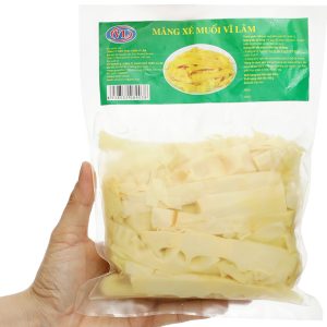 Măng chua muối là món ăn dân dã được nhiều người ưa thích bởi vị chua mát của nó. Sản phẩm măng luộc xé Vĩ Lâm gói 500g rất bắt miệng dùng để ăn kèm hoặc dùng chế biến các món ăn khác như gỏi, canh, lẩu cũng rất ngon, giúp các bà nội trợ chế biến nhanh chóng.