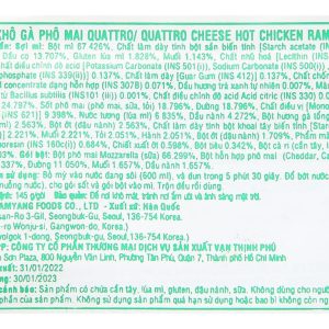 Sản phẩm mì ăn liền thơm ngon hấp dẫn đến từ thương hiệu mì Samyang nổi tiếng Hàn Quốc. Mì khô gà phô mai Quattro Samyang gói 145g có sợi mì dai ngon, thơm ngon và béo ngậy thơm lừng từ phô mai cho bạn bữa ăn ngon hấp dẫn