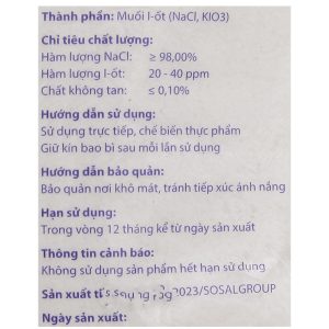 Muối Sosal Group là thương hiệu muối ăn thường được sử dụng trong bữa ăn hằng ngày của mọi gia đình. Muối sấy i-ốt Sosal Group 1kg là loại muối đã được sấy khô, hạt trắng mịn. Muối có màu sắc và vị mặn đặc trưng, được dùng làm phụ gia trực tiếp trong các bếp ăn.