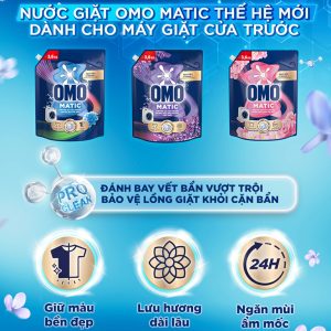 Nước giặt OMO Matic cửa trước ngăn mùi ẩm mốc túi 1.8kg với hương hoa anh thảo thơm mát là sản phẩm nước giặt có tính năng khóa hương giúp ngăn ngừa mùi ẩm mốc khi phơi thiếu nắng, phơi trong mùa mưa suốt 24h. Nước giặt OMO Matic chuyên dụng cho máy giặt cửa trước, giúp tăng tuổi thọ của máy giặt.