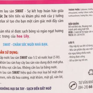 Nước lau sàn SWAT là sự kết hợp hoàn hảo giữa công thức 3x tiên tiến, giúp làm sạch sàn nhà nhưng vẫn đảm bảo dịu nhẹ cho da nhạy cảm. Nước lau sàn còn mang hương thơm tự nhiên dễ chịu. Nước lau sàn Swat hương hoa lily can 4kg can lớn tiết kiệm, giúp cho sàn nhà thơm hoa lily dễ chịu.