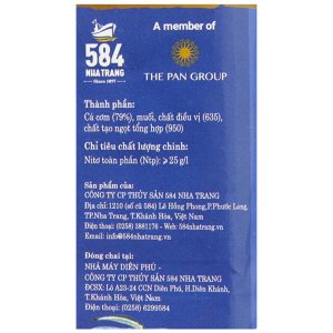 Nước mắm 584 Nha Trang là thương hiệu nước mắm truyền thống được người tiêu dùng Việt yêu thích. Nước mắm nhỉ cá cơm 584 Nha Trang 25 độ đạm chai 1L hương vị đậm đà, màu nâu cánh gián bắt mắt, vị thơm ngọt của cá cơm tươi biển Nha Trang, mang đến gia đình bạn những bữa cơm đầm ấm.