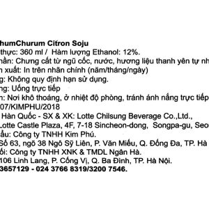 Sản phẩm rượu soju chất lượng từ thương hiệu rượu Chumchurum. Rượu soju Chumchurum vị thanh yên 12% 360ml với hương thơm của gạo nếp, xen lẫn vị thanh yên chua ngọt tươi mát, hấp dẫn, kích thích vị giác cho bạn những cuộc vui sảng khoái cùng gia đình, bạn bè và đồng nghiệp