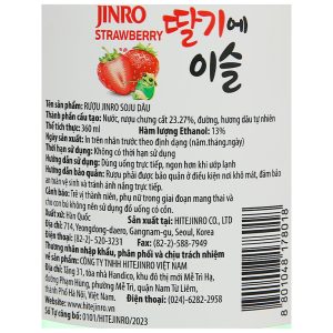 Rượu soju Hàn Quốc hảo hạng từ thương hiệu rượu Jinro. Rượu soju Jinro vị dâu 13% 360ml thơm ngon có vị chua ngọt thanh mát thoang thoảng của dâu cho cảm giác dễ uống, khoan khoái và dễ chịu. Sản phẩm rượu chính hãng, cam kết chất lượng và an toàn