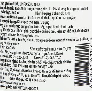 Rượu soju Hàn Quốc hảo hạng từ thương hiệu rượu Jinro. Rượu soju Jinro vị nho 13 độ 360ml thơm ngon có vị chua ngọt thanh mát của nho cho cảm giác dễ uống, khoan khoái và dễ chịu. Sản phẩm rượu chính hãng, cam kết chất lượng và an toàn