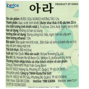 Rượu soju Hàn Quốc thơm ngon hảo hạng từ thương hiệu rượu Korice. Rượu soju Korice vị táo 12% 360ml là sự kết hợp tuyệt vời giữa soju truyền thống và hương vị trái cây với nồng độ nhẹ 12% soJu hương táo mang đến cảm giác ngọt ngào thơm mát của trái táo thơm ngon chín mọng.