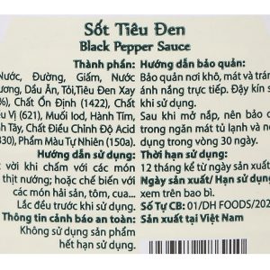 Sốt tiêu đen Dh Foods chai 200g là sản phẩm nước sốt chấm với chất sốt sánh mịn, dễ ngấm vào thức ăn, sốt có hương thơm nồng nàn, cay the đậm đà, hoàn hảo giúp món ăn thêm hấp dẫn và kích thích vị giác. Nước chấm Dh Foods rất phù hợp để chấm với các món steak, thịt nướng, hoặc chế biến với các món hải sản, tôm, cua,…