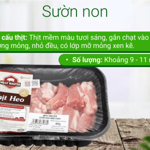 - Sườn non heo Meat Master là phần thịt heo xương nhỏ, thịt nhiều và mềm hơn so với sườn già. Sườn non heo được đóng khay tiện lợi, sạch sẽ, khay 400g từ 9-11 miếng.