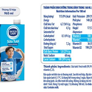Thùng 12 hộp sữa tươi tiệt trùng không đường Dutch Lady 965ml