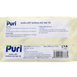 Khăn ướt cho bé thương hiệu khăn ướt Puri với chất liệu Rayon vải không dệt mịn màng, mềm mại, an toàn cho làn da mỏng manh của bé, sử dụng dễ dàng, thuận tiện trong việc vệ sinh hoặc đi chơi xa. Thùng 24 gói khăn ướt Puri không mùi gói100 miếng có nắp đậy, mẹ có thể bỏ túi mang theo.