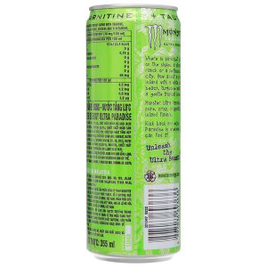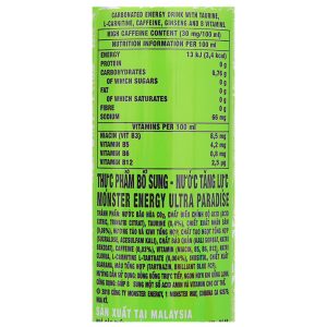 Nước tăng lực dồi dào các thành phần dinh dưỡng như vitamin, taurine, caffeine, inositol,…Thùng 24 lon nước tăng lực Monster Ultra Paradise 355ml chính hãng nước tăng lực Monster nhập khẩu Malaysia hương vị thơm ngon, dễ uống kết hợp táo và kiwi hấp dẫn cho bạn năng lượng mạnh mẽ