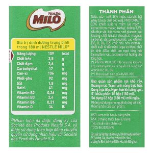 Sản phẩm sữa cacao, socola thơm ngon, giàu canxi và protein giúp cho cơ thể phát triển. Đặc biệt, thương hiệu sữa ca cao lúa mạch Milo nổi tiếng rất được các bé yêu thích và tin dùng. Thùng 48 hộp thức uống sữa lúa mạch Milo Active Go 180ml cung cấp nguồn năng lượng dồi dào cho bé hoạt động mỗi ngày.