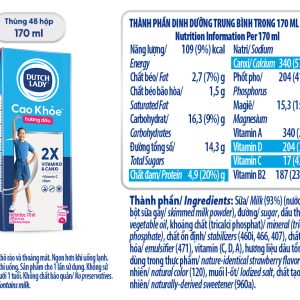 Sản phẩm gấp đôi vitamin D và canxi giúp bé cao khoẻ hơn mỗi ngày. Sữa tiệt trùng hương dâu Dutch Lady Cao Khoẻ 170ml thơm ngon, dễ uống. Thùng 48 hộp có đường giúp bạn tiết kiệm được nhiều chi phí, sử dụng lâu dài