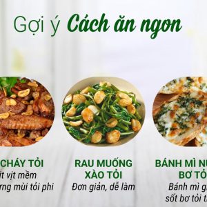 Tỏi có thể ăn sống, ngâm giấm hoặc chế biến kèm theo một số món ăn ngon như: rong biển cháy tỏi, đậu phộng rang tỏi ớt, trứng non lòng gà cháy tỏi,…
