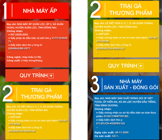 Bước 2: Xem thông tin sản phẩm bao gồm: nhà máy ấp, trại gà thương phẩm, cơ sở sản xuất – đóng gói.